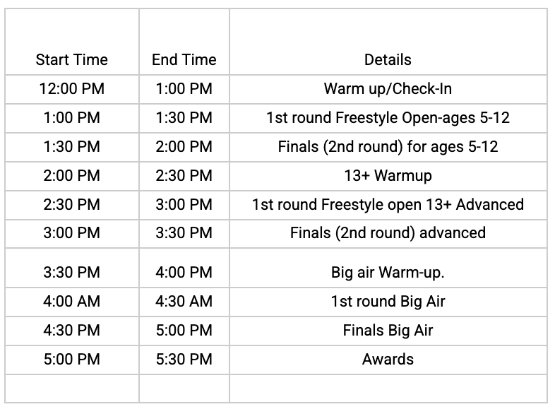 Show support for all athletes regardless of results. Judges may stop unsafe or inconsistent skills. Dangerous “chucking” of tricks is not permitted. Respect staff and judges – disrespect will result in removal. Showcase skills you can land confidently and safely.